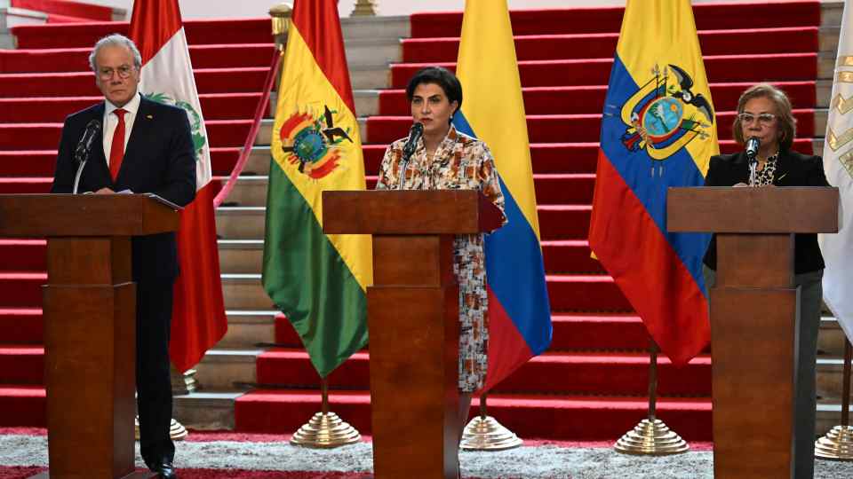 La ministra de Relaciones Exteriores de Colombia, Rosa Yolanda Villavicencio (der.), su homóloga ecuatoriana María Sommerfeld (centro) y el embajador peruano Gonzalo Gutiérrez, secretario general de la Comunidad Andina (CAN), participan en declaraciones sobre la transferencia de la presidencia pro tempore de la Comunidad Andina, en Bogotá, el 30 de septiembre de 2025. (Foto de Raúl Arboleda / AFP)