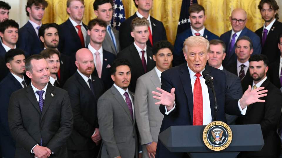 El presidente de Estados Unidos, Donald Trump, habla junto a los equipos de béisbol universitario de la Universidad Estatal de Luisiana (LSU) y LSU Shreveport, ganadores de la Serie Mundial Universitaria y los Campeonatos Nacionales de este año, respectivamente, en la Sala Este de la Casa Blanca en Washington, DC, el 20 de octubre de 2025. (Foto de SAUL LOEB / AFP)