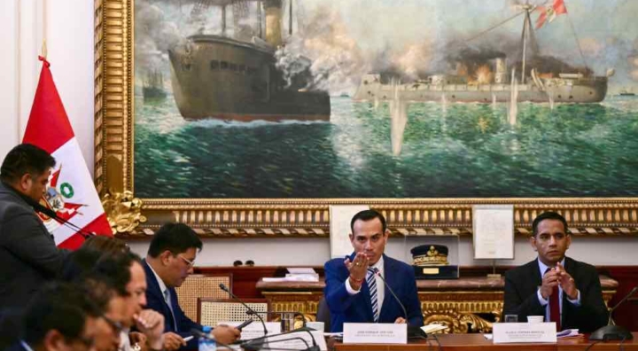 El presidente de Perú, José Jerí (centro), y el presidente de la comisión de fiscalización, el congresista Elvis Vergara (derecha), asisten a una comisión del Congreso sobre presuntas irregularidades en reuniones con empresarios chinos, en el Congreso de la República en Lima, el 21 de enero de 2026. ERNESTO BENAVIDES / AFP Foto por ERNESTO BENAVIDES / AFP