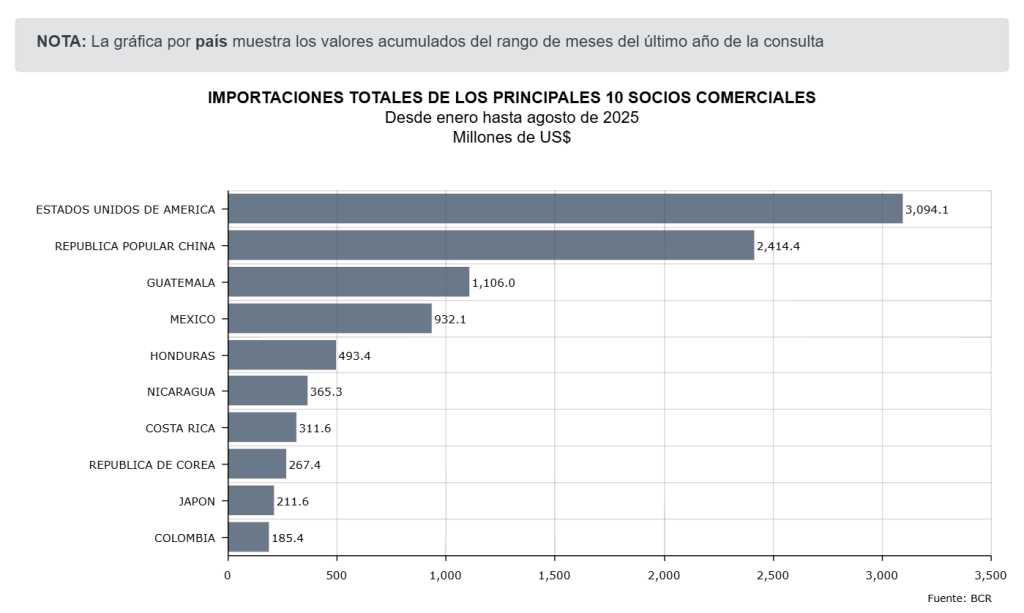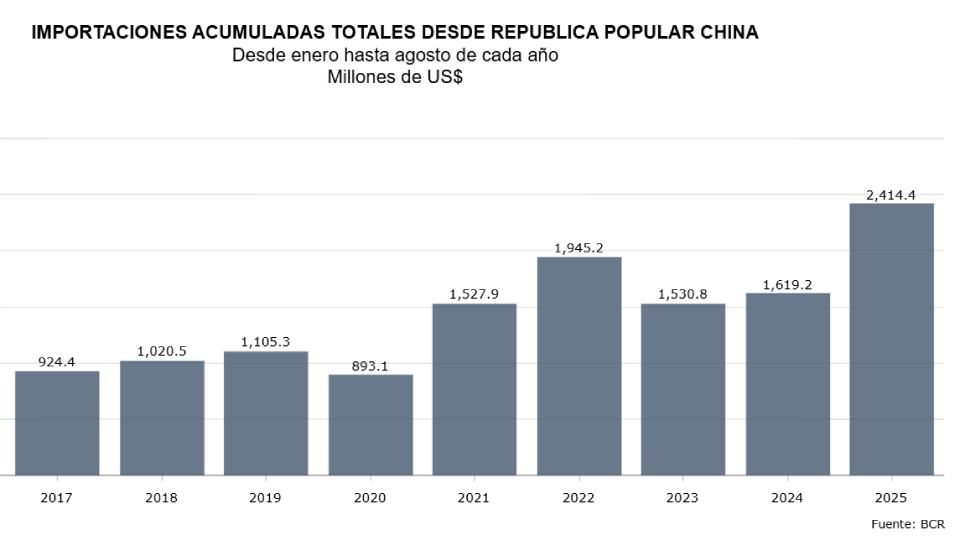 El Salvador importó 2.414 millones de dólares desde China entre enero y agosto de 2025, según los últimos datos publicados por el Banco Central de Reserva (BCR) del país centroamericano.