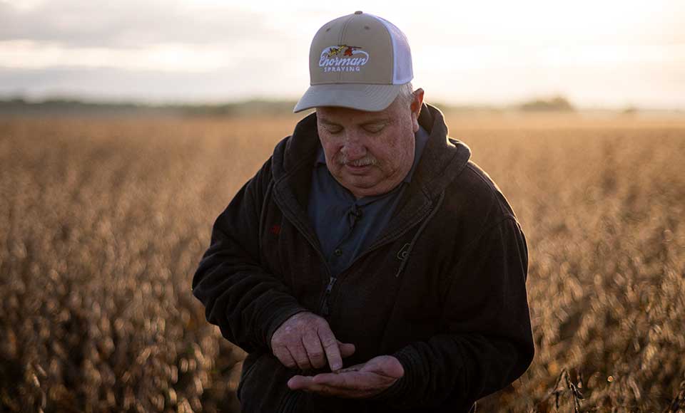 La cosecha de soja en Estados Unidos está en marcha y en el rural Maryland, el agricultor Travis Hutchison abre una cáscara de soja para mostrar cómo el campo está casi lo suficientemente seco para la siega.