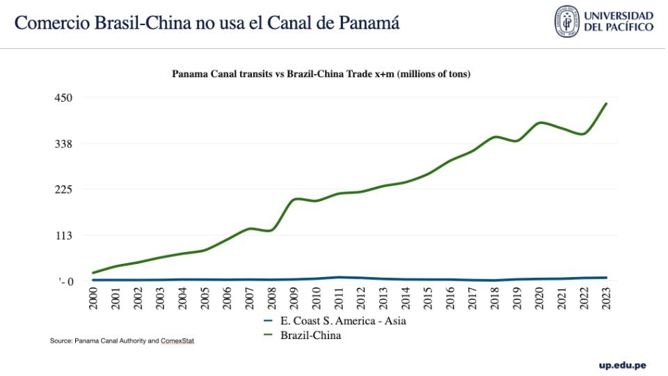 Lo que pasa por el Canal de Panamá [desde] toda la costa este de Sudamérica con el Asia… cuando [se compara] solo con el comercio de Brasil con China, podemos ver que son volúmenes insignificantes; son números bastante bajos en esa perspectiva comparada.