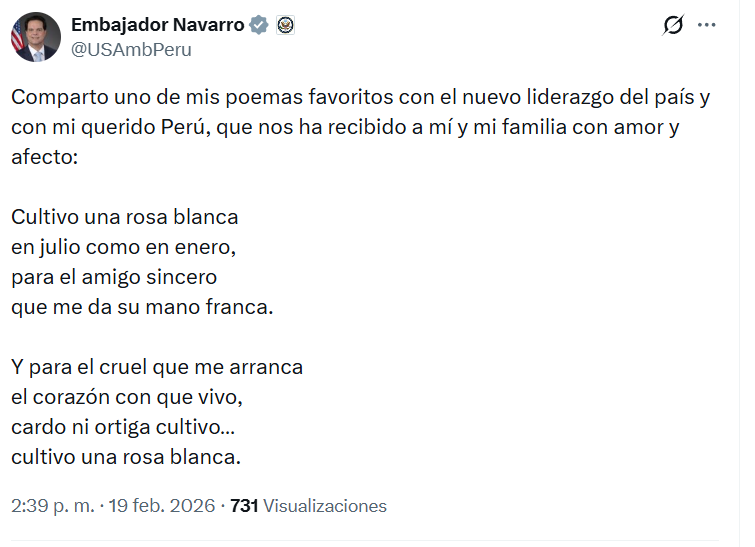 En este clima de vulnerabilidad política, el embajador Bernie Navarro reforzó el apoyo a Jerí con una fotografía comiendo hamburguesa el 10 de febrero.