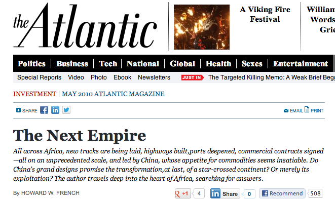 In the end, French reaches the same, stereotypical conclusion that most Western writers come to with their China in Africa stories, that Beijing is merely following the same path of colonial exploitation as Europeans and Americans did during their imperial